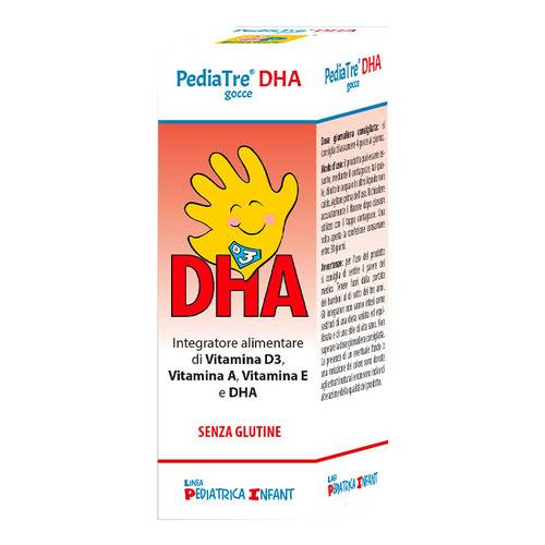 PediaTre DHA gocceDescrizione Integratore alimentare di Vitamina D3, Vitamina A, Vitamina E e DHA. La Vitamina D contribuisce al normale assorbimento del calcio e del fosforo ed aiuta a mantenere le ossa e i denti sani. Contribuisce inoltre alla normale funzione del sistema immunitario. Ingredienti Olio di mais, olio da microalghe Schizochytrium sp. TiT. al 35% in DHA (contiene olio di semi di girasole, emulsionane: lecitina di girasole, aroma, antiossidanti: ascorbile palmitato, tocoferoli), vitamina E (acetato di DL-alfa- tocoferile), vitamina A (palmitato di retinile), vitamina D3 (colecalciferolo). Senza glutine. Caratter...